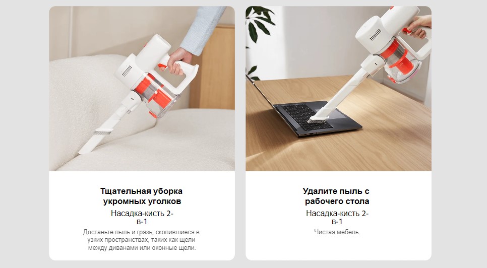 Особенности | до 40 минут автономно работы, насадка 2-в-1 позволяется произвести уборку в узких местах |