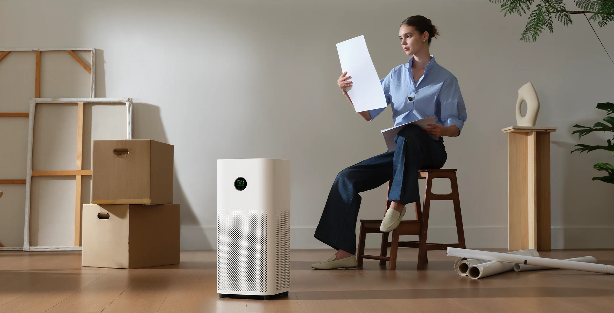 Mijia Smart Air Purifier 6 выполнен в традиционном для линейки минималистичном стиле: строгий белый корпус с ровными гранями и аккуратными воздухозаборными решётками вписывается в любой интерьер. Высота чуть более полуметра делает устройство заметным, но не громоздким, а квадратная форма позволяет размещать его и в углу, и рядом с мебелью. Очиститель стоит устойчиво и рассчитан на напольную установку, а продуманная конструкция обеспечивает равномерное распределение очищенного воздуха по комнате.